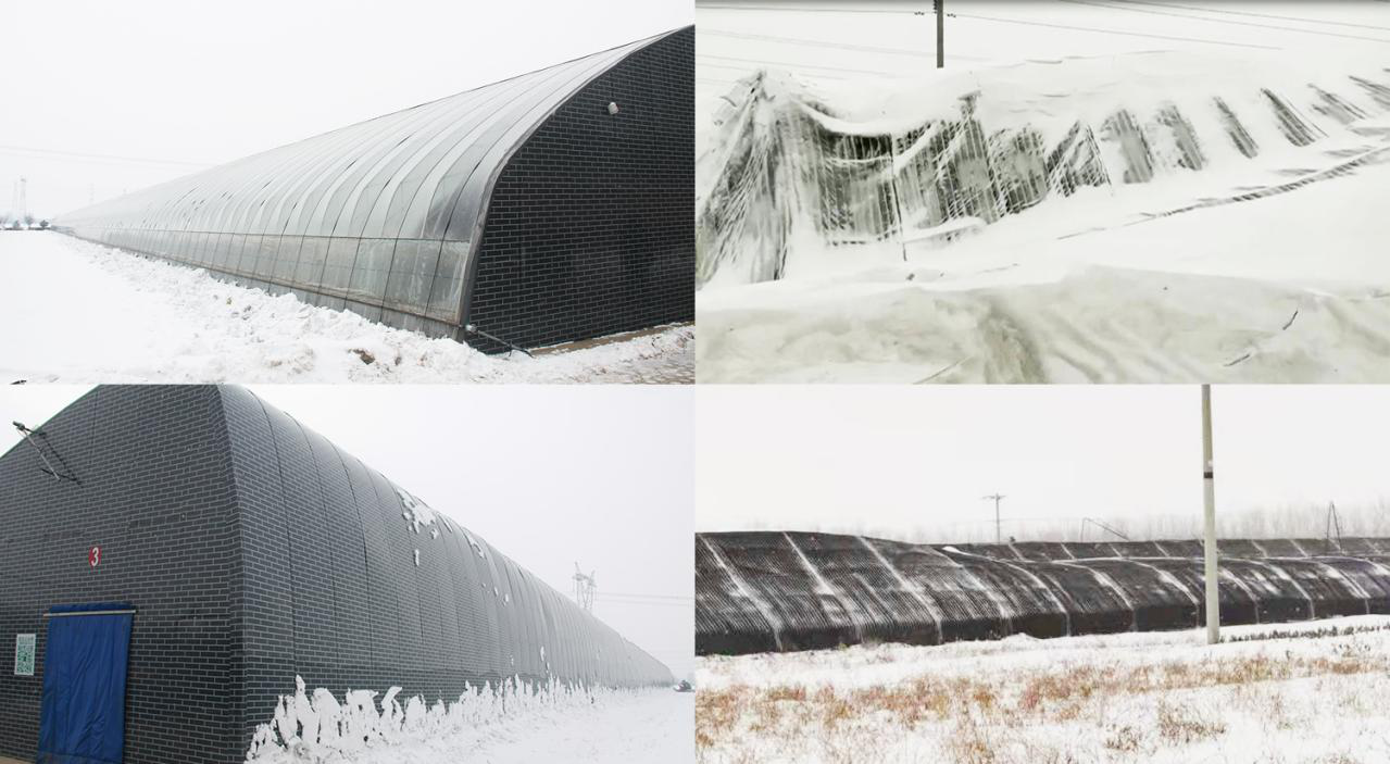 在寒冷的冬季里,若遇到突如襲來的降雪或狂風,北方高寒地區設施農業生產將會受到嚴重影響,北方多數溫室因為積雪和狂風導致坍塌,而這時水蓄熱內保溫裝配式日光溫室表現出強勁的使用性能。圖一為水蓄熱內保溫裝配式日光溫室,內保溫被正常卷起,落在溫室棚膜上的積雪自動滑落,不影響設施使用及作物生長。圖二為普通外保溫溫室,外保溫被積雪,不能卷起,設施承重增加,多半溫室被積雪壓塌,嚴重壓傷農作物,同時溫室內無光照,無法積溫及進行作物生長。